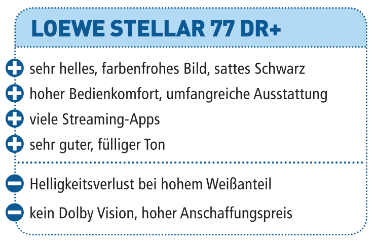 Mit dem stellar 77 dr+ hat Loewe einen in vielerlei Hinsicht außergewöhnlichen Fernseher auf den Markt gebracht, der audiovisuell und qualitativ Maßstäbe setzt. Auch beim Betriebssystem spielt man in der ersten Liga, so dass der Einzug in unsere Referenzklasse die logische Konsequenz ist.