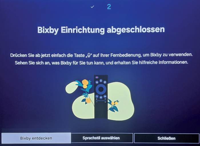 Stimmgewaltig: Mit Bixby hat Loewe den Sprachassistenten von Samsung integriert. Zum Aktivieren muss man die kleine Zusatzfernbedienung benutzen.