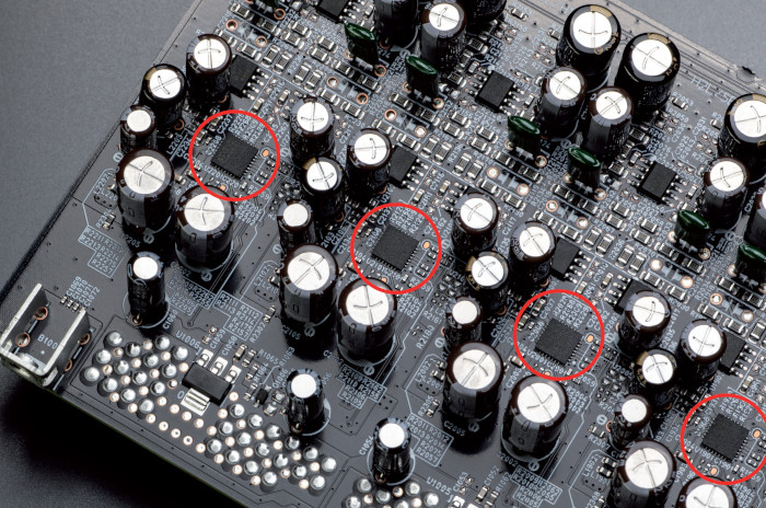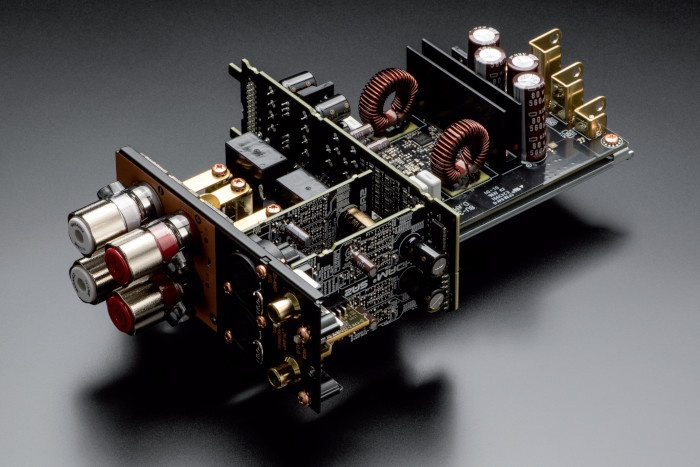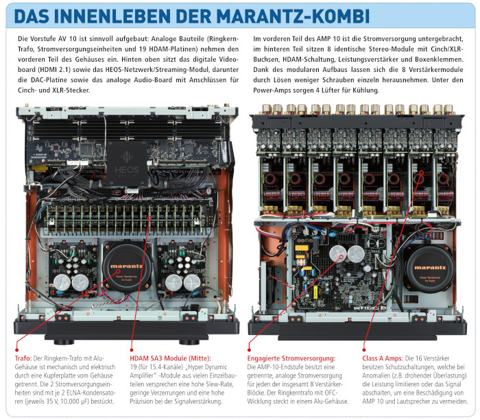 Die 16-Kanal-Endstufe AMP 10 arbeitet mit einem leistungsfähigen Ringkern-Trafo. Bei der Eingangsstufe kommt Marantz‘ verfeinerte HDAM-Technik SA2 (Hyper Dynamic Amplifier Module) bei allen Signalpfaden (Cinch und XLR) zum Einsatz, welche das Kleinsignal an die Verstärker mit niedriger Impedanz und hoher Slew-Rate sendet. Die 16 Endstufen sind nach dem Prinzip von Schaltverstärkern (Class-D-Verstärker) konzipiert und wurden nicht etwa zugekauft, sondern von Marantz selbst entwickelt. Die Bauweise bietet eine bessere Leistungsausbeute bei geringerer Wärmeentwicklung und niedrigerem Stromverbrauch im Vergleich zur analogen Class-A/B-Verstärkung. Auf eine aktive Kühlung konnte Marantz trotzdem nicht verzichten und integrierte 5 Lüfter, die angenehm leise ihren Dienst verrichten. Warm wird das Gehäuse dennoch, weshalb es ratsam ist, keine Geräte (etwa die Vorstufe wie im Bild auf der linken Seite) auf die Endstufe zu stellen und stets für ausreichend Luftzirkulation zu sorgen.