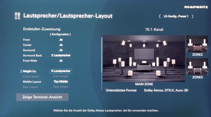 Für die Signalverarbeitung kommt ein Dualcore-Prozessor (1 GHz) von Analog Devices (ADI SHARC+) zum Einsatz. Wie es sich für eine moderne Vorstufe gehört, hat Marantz alles reingepackt, was in absehbarer Zeit benötigt wird: Dolby Atmos (15.4), DTS:X Pro (15.4) und Auro 3D (13.1) sowie deren Upmixer Dolby Surround, DTS Neural:X und die Auro-Matic – inklusive Cross-Format-Upmixing. Der Auro-Decoder funktioniert jetzt auch mit Deckenlautsprechern an „Top“-Positionen (Front, Middle, Rear), bisher ging Auro nur mit „Height“-Boxen. Top-Front-Boxen erhalten dabei eine Mischung aus den Tonsignalen von Front-Height und Center-Height, die Top-Middle-Lautsprecher bekommen den Voice-of-God-Kanal zugespielt. Das ist insofern bemerkenswert, als Auro jahrelang predigte, „Height“-Lautsprecher müssten im Winkel zwischen 20 und 40 Grad (optimal 30 Grad) zum Zuhörer abstrahlen. Auch Dolby wird flexibler und unterstützt jetzt seitliche Surround-Height-Lautsprecher (nicht zu verwechseln mit den hinteren Rear-Heights), was der Marantz ebenso beherrscht. Zudem gibt die AV 10 IMAX-Enhanced-Inhalte wieder, bei den Virtualisierern sind DTS Virtual:X und die Dolby Atmos Height Virtualization dabei. Hinzu kommen das im Broadcasting-Bereich verwendete MPEG-H des Fraunhofer Instituts sowie Sonys Musik-Streaming-Format 360 Reality Audio. Das einzige DSP-Programm nennt sich „Virtual“ und verbreitert bei der Stereo-Wiedergabe das Klangfeld.