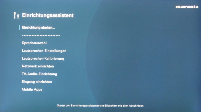 Alle Bildschirmmenüs präsentieren sich seit dieser Generation in einem eleganten, modernen Design samt neuen 1080p-Grafi ken und neuem Wortlaut der stets verständlichen Erklärungen. Zwar könnte das Navigieren durch Menüs schneller klappen, doch die leichte Verzögerung wird durch Auf- und Abblenden kaschiert. Sich über das laufende Bild legende Menüs (Info, Option) sind simpel und elegant sowie übersichtlich und praktikabel gestaltet. Besonders hilfreich für Einsteiger ist der Einrichtungsassistent, der beim ersten Einschalten des Geräts ausführlich durch Punkte wie Lautsprecher-Setup, Raumeinmessung, Netzwerk und Quellenanschluss führt.