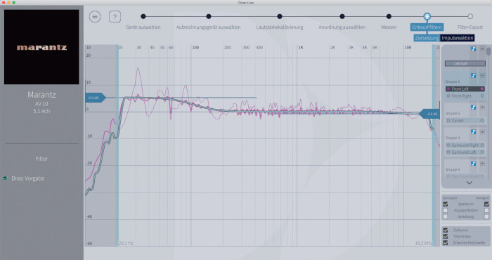 Auf Basis einer veränderbaren Zielkurve, die sich nach persönlichen Vorlieben modellieren lässt, erfolgt die Frequenzgang-Optimierung; auch der Subwoofer-Kanal lässt sich anpassen. Seit Version 3.3 gibt es in Dirac eine automatisch generierte Zielkurve, die Optimierung erfolgt einerseits mit zwei Griffen links und rechts im Filter-Design-Fenster (siehe Bild), die auf Bässe und Höhen Einfluss nehmen. Alternativ kann mit Ankerpunkten für eine differenziertere Manipulation des Frequenzgangs gearbeitet werden. Im finalen Schritt wird die Frequenzkurve auf die AV 10 übertragen und automatisch im Lautsprecher-Preset 2 abgelegt; bis zu 3 Dirac-Filter kann die Marantz-Vorstufe in sogenannten „Slots“ speichern. Das Boxen-Preset 1 kann für Audyssey genutzt werden, was den Vergleich zwischen beiden Einmess-Systemen erlaubt. Am Ende sollte man sein Dirac-Projekt speichern, um jederzeit wieder Änderungen daran vornehmen zu können. Wie gut Dirac im Vergleich zu Audyssey klingt, erfahren Sie auf der nächsten Doppelseite im Abschnitt „Tonqualität“.
