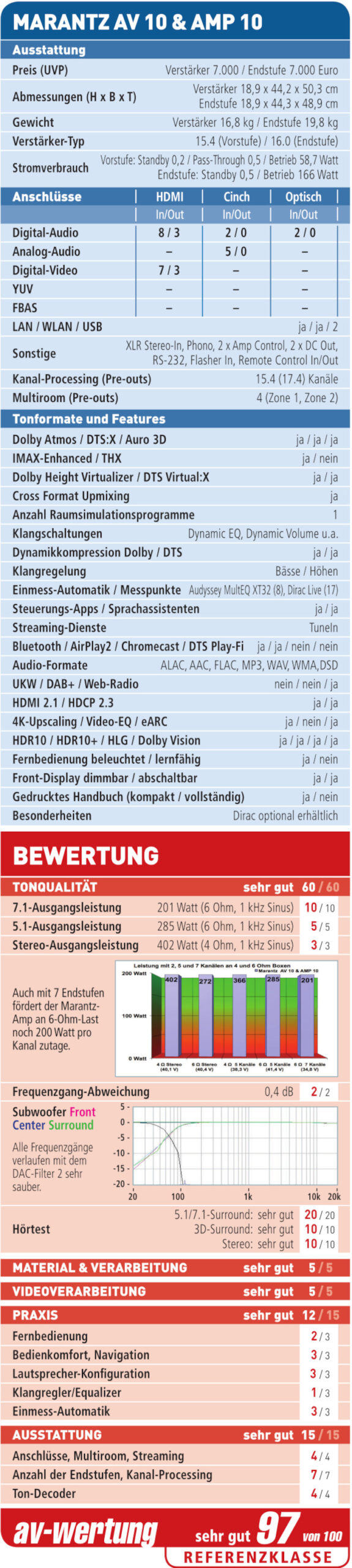 Über mangelnde Leistung kann man sich beim AMP 10 nicht beschweren: Die Messungen ergaben im 7.1-Betrieb (6 Ohm) üppige 201 Watt pro Kanal. Mit 5 aktiven Endstufen legte der Amp stolze 285 Watt (6 Ohm) bzw. außergewöhnlich hohe 366 Watt (4 Ohm) pro Kanal an den Tag. Im Stereo-Modus kletterte die Power sogar auf 272 (6 Ohm) Watt bzw. 402 Watt (4 Ohm) pro Kanal. Der durchschnittliche Stromverbrauch der AMP-10-Endstufe lag dank Digital-Verstärkern bei klimafreundlichen 166 Watt, in der Regel saugen Endstufen und AV-Receiver das Doppelte aus der Steckdose. Die Vorstufe AV 10 begnügte sich mit knapp 60 Watt.