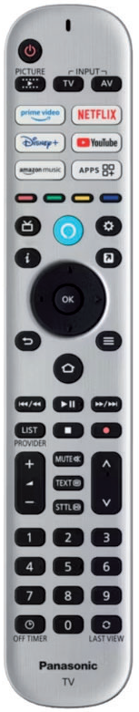 Zum ersten Mal überhaupt ist die Alexa-Sprachsteuerung für einen Panasonic-Fernseher ohne externe Helferlein verfügbar. Über eingebaute Mikrofone im Gehäuse ist ein Griff zur Fernbedienung überflüssig. Diese besteht aus Plastik, ist aber angenehm schwer, liegt satt in der Hand und verfügt über eine plausible Tastenanordnung. Für fünf Streaming-Portale sind Direktwahltasten verbaut, unter anderem für Amazon Music und Disney+.