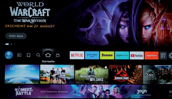In Bezug auf die Cinemascope-Balken gilt das ohnehin. Sie sind gnadenlos schwarz, auch hellere Bildschirminhalte scheinen nicht durch. Große schwarze Flächen sind bestmöglich homogen ausgeleuchtet, egal, ob man frontal oder von der Seite auf das Panel schaut. Ein Genuss für Cineasten. Die dürfen sich auch über perfekt geschmeidige Kamerafahrten freuen. Glücklicherweise hat Panasonic seine umfangreiche „Intelligent Frame Creation“ unter anderem mit „Blur-Reduktion“, „Film Smooth“ und „Clear Motion“ im Fire-TV-Betriebssystem implementiert. HDR-Titel sind der Hammer. Wir genießen einen Dolby-Vision-Clip auf YouTube über die schönsten Plätze der Erde. Wow, wie lebendig die Kulisse hier aussieht, wie unfassbar plastisch, realistisch und detailverliebt. Nachtaufnahmen von Städteansichten explodieren förmlich vor hell strahlenden Lichtern und feinsten Reflexionen.