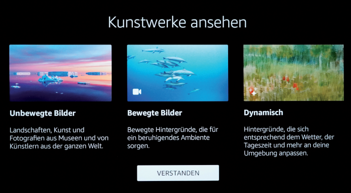 Auf dem 65-Zöller kann man diese klein oder groß einblenden. Inhaltlich befassen sich die Widgets auf dem Panasonic Z90A mit lokalen Wetterdaten, den zuletzt gehörten Musiktiteln, den Top-10-Bewegtbildangeboten auf Fire TV, den eigenen Smart-Home-Settings und dem Live-TV-Programm. Zudem können Haftnotizen eingeblendet werden. Welche Widgets auf dem Flat-TV dargestellt werden sollen, legt man in Eigenregie fest. Als Hintergrundbilder hat man die Wahl zwischen unbewegten, bewegten und dynamischen Motiven, unter anderem aus den Genres Landschaft, Kunst, Fotografie und Museen. Die Geschwindigkeit der Hintergrund rotation ist stufenweise anpassbar zwischen einer Minute und einem Tag. Uhrzeit und Wetterinformationen oben links lassen sich ein- oder ausblenden.