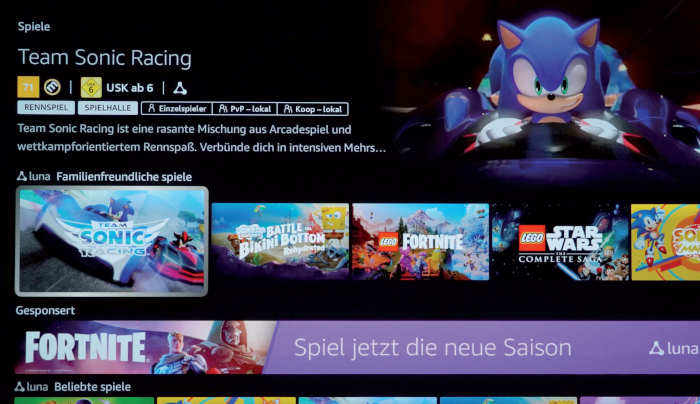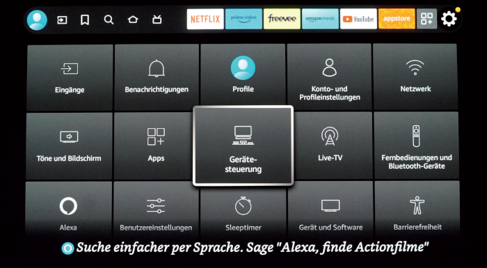 Glücklicherweise verzichten die Japaner in ihrem Fire TV-Fernseher nicht auf den von uns hoch geschätzten Penta-Tuner. Kabel, Satellit und DVBT2 werden doppelt empfangen – so kann man eine Sendung auf USB-Festplatte aufzeichnen und parallel ein anderes Programm anschauen. Außerdem ermöglicht der Apparat den IPTV-Empfang über das Heimnetzwerk. Der Flat-TV lässt sich somit unabhängig von einer Antennendose im Haus aufstellen. Die Einrichtung gelingt klassisch per Fernbedienung oder mittels „Fire TV“-App auf einem Smartphone. Über ein Mobilgerät ist der 65-Zöller nach wenigen Sekunden betriebsbereit. Der Startbildschirm listet neben Amazon Prime Video wichtige Streaming-Apps wie Netflix, Paramount+, Joyn, WOW, Magenta TV, Apple TV+, Disney+, Netzkino und DAZN auf (siehe auch App-Vergleich Seite 46), außerdem TV-Eingänge, TV-Sender, die Aufzeichnungsliste und bei Bedarf einen großen Fundus an Spielen. Die Bedienung gelingt intuitiv, das Arbeitstempo ist hoch. Für unterschiedliche Familienmitglieder lassen sich individuelle Konten für personalisierte Vorschläge anlegen.