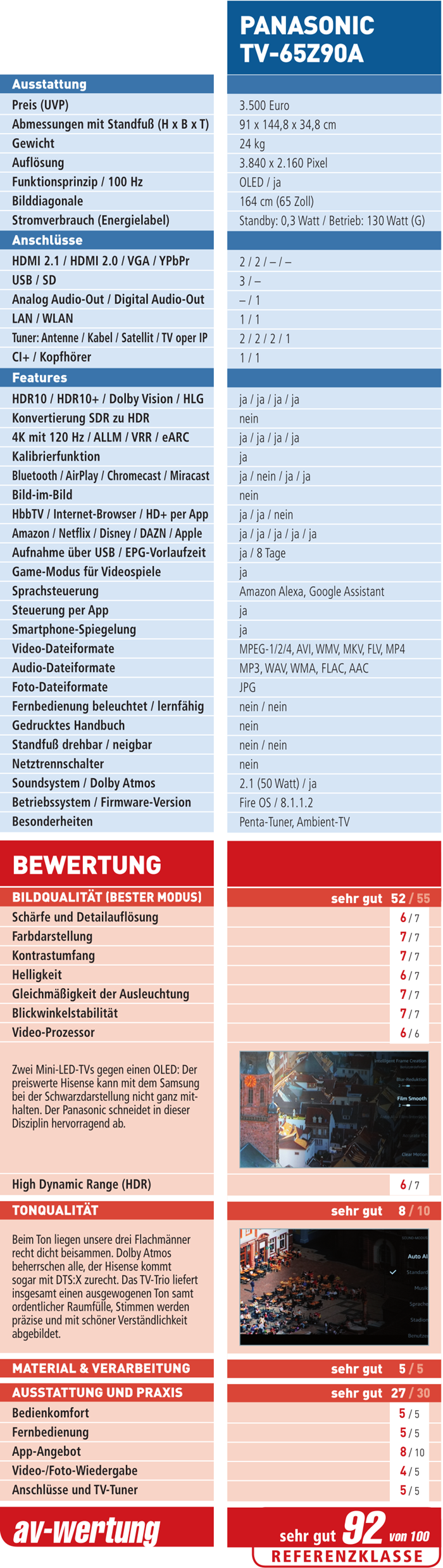 Der neue TV-65Z90A ist enorm hell und begeistert durch reine Farben und ein extrem authentisches Bild mit genialem Schwarz. Fire TV bietet den Zugang zu vielen Apps, auch der Rest der Ausstattung – inklusive Penta-Tunter – kann sich sehen lassen. Das Ergebnis landet in unserer Referenzklasse.