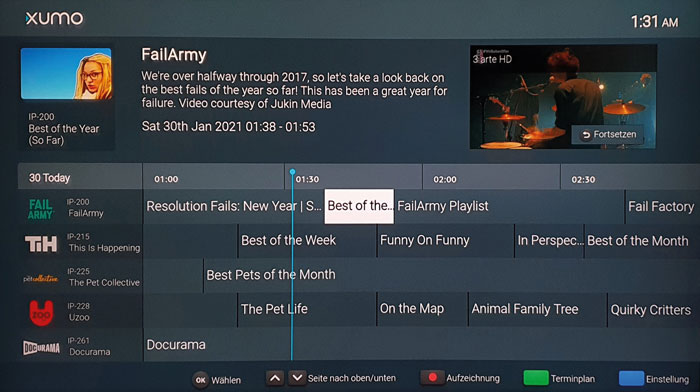 Willkommen im EPG: Der Elektronische Programmführer sortiert sowohl die Xumo-Sender als auch die Programme per Kabel, Satellit und DVB-T2 ein.