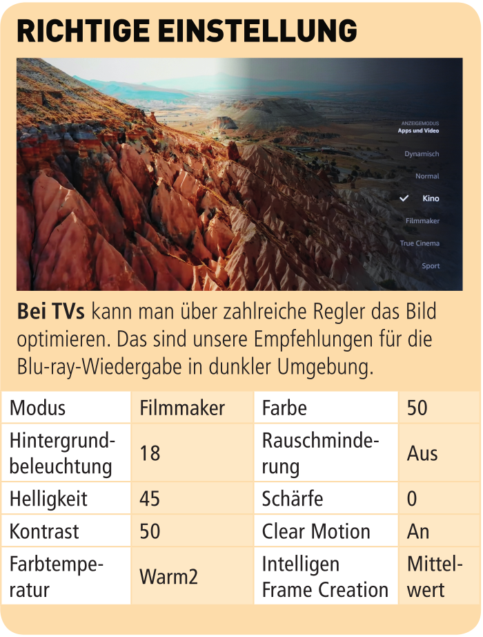 Für möglichst kräftige Farben sollte man zentral vor dem Panel sitzen, seitlich lassen farbliche Power und Kontrast spürbar nach. Obwohl Panasonic kein 100-Hertz-Display verbaut hat, gelingen Bewegungen weich und ruhig. Dazu muss allerdings die Bewegungskompensation aktiviert sein. Die „Intelligent Frame Creation“ stand im Test auf „Mittelwert“. An HDR-Formaten unterstützt der 55-Zöller HLG, HDR10, HDR10+ Adaptive und Dolby Vision – High-Dynamic-Range-Inhalte sehen lebhaft, kraftvoll und farblich wirklich ansprechend aus. Die Durchzeichnung in dunklen Sequenzen gelingt hier akzeptabel.