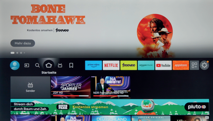 Die Einrichtung ist unkompliziert und gelingt per „Fire TV“-App auf Mobilgeräten mit Android- und iOS-Betriebssystem intuitiv. Fire OS ist ansprechend gestaltet (siehe Kasten rechte Seite), etwas störend sind die horizontalen Werbebanner. Wer in seiner Freizeit gerne Filme und Serien streamt, kommt hier maximal auf seine Kosten. Mit Amazon Prime Video, Netflix, Joyn, Netzkino, Paramount+, WOW, Disney+, Zattoo, DAZN, Magenta TV, Apple TV+ und vielen mehr genießt man eine riesige Auswahl, hinzu kommen jede Menge Musik und Spiele (mehr zum App-Angebot auf Seite 42). Der 55-Zöller reagiert flott, Menüs wechseln schnell und Apps starten zügig, lediglich die Umschaltzeiten der TV-Sender dürften gerne ein wenig kürzer sein.