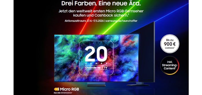 Samsung ist seit 20 Jahren Marktführer im TV-Bereich und auch bei Soundbars hält Samsung seine Position an der Spitze des globalen Markts. Das will gefeiert werden! Und zwar mit attraktiven Cashback-Angeboten auf die neuesten Home-Entertainment-Produkte: Wer bis zum 17. Mai einen ausgewählten Micro RGB-, Mini LED- oder Lifestyle-TV oder ein Aktions-Soundgerät kauft, erhält bis zu 900 Euro zurück. Dazu gibt es im Rahmen von „Made for Germany“ bis zu 12 Monate lang kostenlosen Streaming-Content.