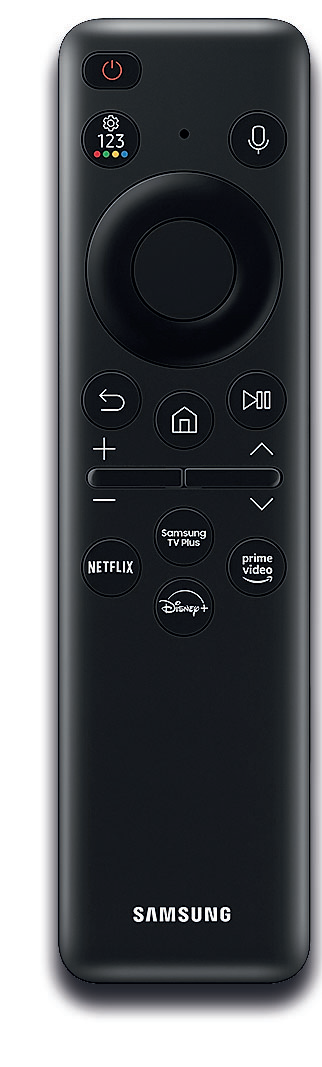Klein und fein: Durch die Tasten-Mehrfachbelegungen lässt sich der Samsung-Steuerstab nicht ganz so intuitiv wie andere Fernbedienungen betätigen. Hat man das Konzept einmal verinnerlicht, kommt man mit dem schwarzen Helfer aber problemlos zurecht. Geladen wird die Fernbedienung per Sonnen- und Kunstlicht oder via USB. So braucht man nie mehr die Batterien zu wechseln.