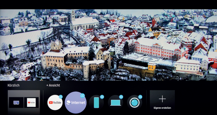 Eigene erstellte Layouts lassen sich mit den gewünschten Quellen speichern und können beim nächsten Mal direkt gestartet werden. Um ein Smartphone mit dem Flat-TV zu verbinden, genügt es, dieses an den Flachmann zu erhalten. Dank NFC (Near Field Communication) wird eine Verbindung automatisch aufgebaut. Anschließend lässt sich der Inhalt auf den Samsung spiegeln, eine parallele Darstellung mit einem anderen Inhalt ist ebenfalls möglich.