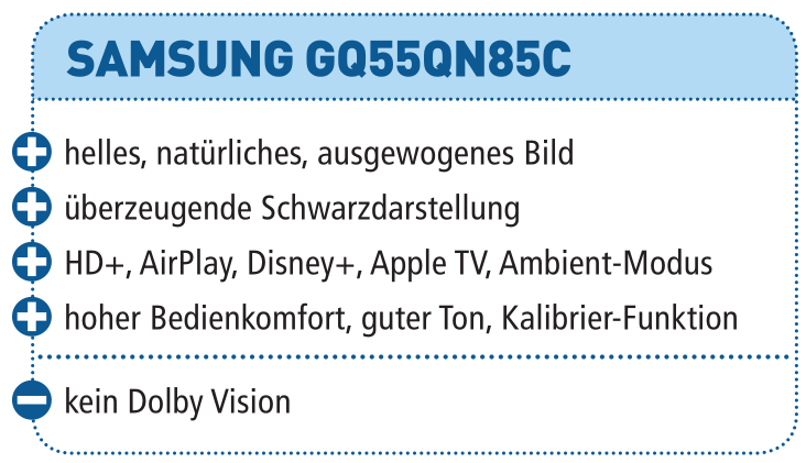 Wow, mit dem GQ55QN85C erhält man extrem viel Fernseher für vergleichsweise wenig Geld. Dazu einen Flat-TV ohne Schwächen: Helligkeit, Farbdarstellung, Schwarzwert, Ausstattung, Bedienkomfort und Ton: Der 55-Zöller ist ein Rundum-sorglos-Paket, bei dem man sich lediglich noch Dolby Vision an Bord wünschen würde.