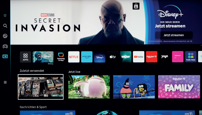 Die Tizen-Oberfläche mit schwarzem Hintergrund und farbigen Kacheln ist übersichtlich, informativ und stylisch. Hier hat man Zugriff auf eine riesige App-Auswahl, dazu gehören unter anderem HD+, Disney+, Apple TV+, WOW, Rakuten TV, Joyn und Magenta TV. Ganz neu an Bord ist die App FIFA+, die nicht nur alle Spiele der Fußball-Weltmeisterschaften, sondern auch Dokumentationen, Dokuserien und Portraits zugänglich macht.