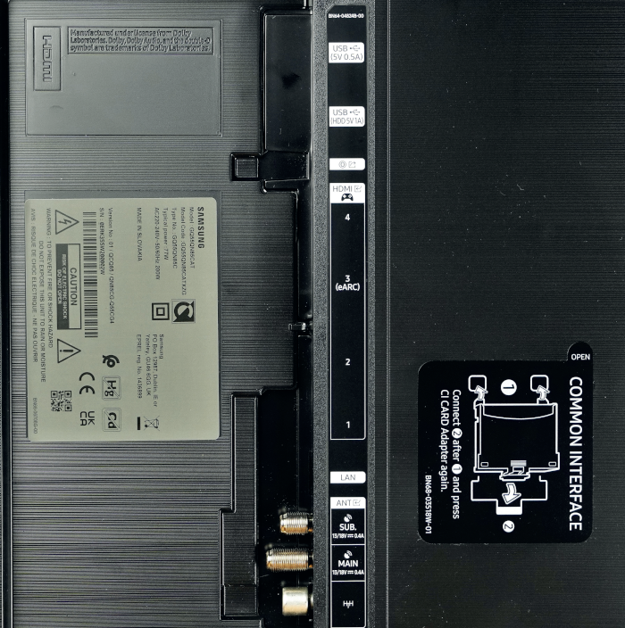 Stark: Der GQ55QN85C ist mit Twin-Tunern und vier HDMI-Ports ausgestattet, die alle HDMI 2.1 unterstützen. „CI+“-Module werden per Adapter angeschlossen.