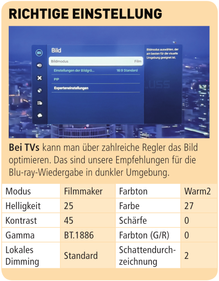 Die Schwarzdarstellung des Flachmanns ist richtig gut. Schaut man frontal auf das Display, so sind Aufhellungen um weiße Objekte kaum existent; selbst von der Seite gesehen, schlägt er sich wacker. Die Homogenität der Ausleuchtung ist klasse, Filmbalken bereiten auch in komplett abgedunkelten Räumen viel Freude. Damit eignet sich der 55-Zöller sogar für anspruchsvollere Heimkinos.
