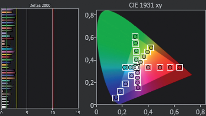 Fehlerfreie Messwerte: Im SDR-Farbraum leistet sich der Koreaner keinen Patzer. Das „Filmmaker“-Setting garantiert ein bestmögliches Ergebnis.