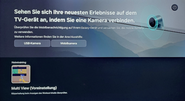 Auf dem GQ55QN85D kann man zwei Quellen gleichzeitig darstellen – der „Multi View“-Modus macht es möglich. Samsung bietet zwei Layouts zur Auswahl an: Entweder werden beide Fenster gleich groß nebeneinander dargestellt, oder ein Inhalt wird in einem kleineren Fenster oben rechts eingebettet. Auch das Live-Bild einer Webcam lässt sich auf dem Panel anzeigen, insofern diese über ein USB-Kabel mit dem 55-Zöller verbunden ist. Praktisch ist die Option, die Smartphone-Kamera auf dem Flat-TV zu nutzen, etwa, um bei Workouts die eigenen Übungen auf die korrekte Ausführung hin zu kontrollieren. Wahlweise scannt man per Smartphone einen QR-Code vom Fernseher ab oder man wählt die Kamera in der „SmartThings“-App aus. Hier muss man zunächst die Kamerafreigabe erteilen. Voraussetzung sind mindestens die Software-Versionen Android 10 oder iOS 13.