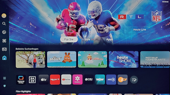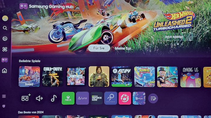 Als Benutzeroberfläche vertraut Samsung auf sein bewährtes wie ausgereiftes Tizen OS. Hier gelangt man direkt zu zahlreichen Apps und vielen Streaming-Diensten wie Disney+ und Amazon Prime Video (siehe App-Check auf Seite 46). Zudem gewährt Samsung TV Plus ohne Anmeldung Zugang zu mehr als 200 kostenlosen Live-TV-Kanälen und tausenden Filmen. Außerdem hat man den Gaming Hub mit vielen Cloud-Gaming-Diensten im Blick, der eine Konsole überflüssig macht, kann über Daily+ seine täglichen Aktivitäten verwalten und mittels SmartThings alle kompatiblen Geräte mit dem Fernseher steuern. Philips Hue Sync erlaubt eine synchrone Beleuchtung zu TV- und Spiele-Inhalten auf dem Flatscreen. Smartphones mit NFC-Unterstützung (Near Field Communication) kann man durch Berührung mit dem Rahmen mit dem 55-Zöller koppeln, um beispielsweise Fotos und Videos komfortabel zu streamen.
