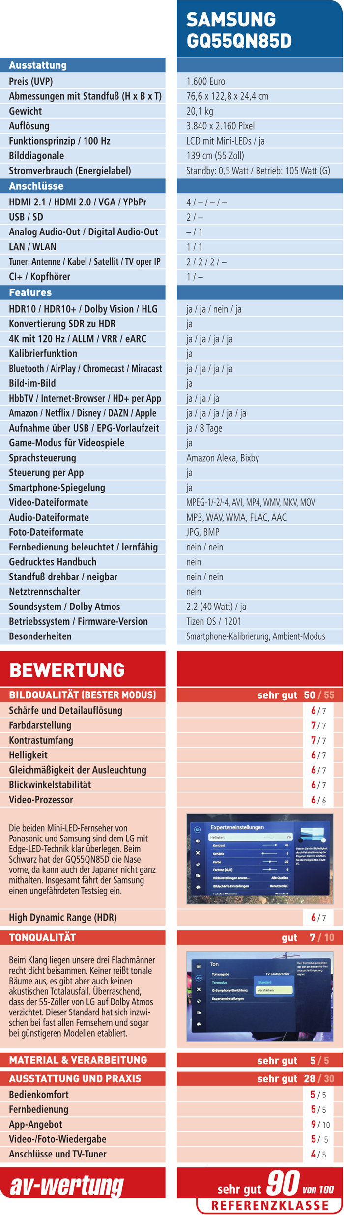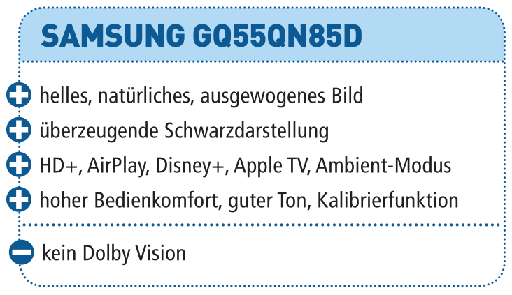 Günstiger als mit dem GQ55QN85D kann man kaum in die Referenz klasse vordringen! Schwarzdarstellung, Helligkeit, Ausstattung und Bedienkomfort sind top; so ist die fehlende Dolby-Vision-Unterstützung der einzige echte Kritikpunkt.