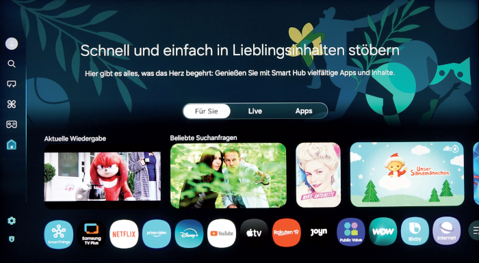 Praktisch: „Daily Board“ zeigt bei Bedarf hilfreiche Informationen etwa zum Wetter und Widgets auf dem Display an, sobald man den Raum betritt. Beim Verlassen des Zimmers schaltet sich der Bildschirm ab. Diese Funktion steht ebenfalls über die Sprachsteuerung (Alexa und Bixby) bereit. Einen frischen Anstrich hat die „SmartThings“-App bekommen – hierüber kann man auch auf die Kunstwerke zugreifen, den Flachmann steuern, das Smartphone als virtuelles Gamepad verwenden und Apps starten. Von denen hat der Samsung jede Menge an Bord. Wer gerne streamt, freut sich mitunter über HD+, WOW, Joyn, Apple TV+, Disney+, Netflix, Amazon Prime Video und RTL+.