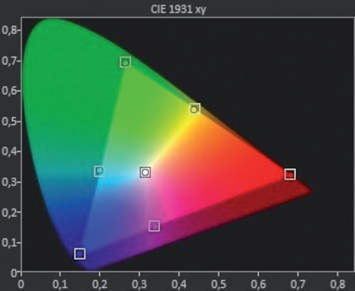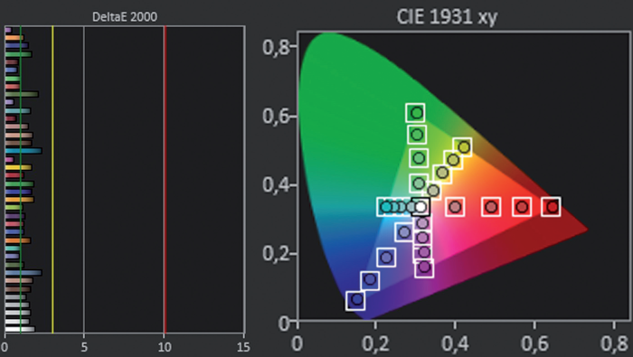 Die Messung in unserem Testlabor beginnt mit einem Paukenschlag! Hier schafft der Samsung im farblich besten „Filmmaker“-Setting satte 2.230 Candela in der Spitze. Beim Vorgänger war bei 1.947 Candela Schluss. Stolze 1.190 sind es bei einem Weißanteil von 50 Prozent, und in der kompletten Fläche strahlt der QN90F immer noch mit überragenden 780 Candela – das schafft kein OLED. Der ANSI-Kontrastwert von 1.900:1 lässt erahnen, dass der Samsung auch bei der Schwarzdarstellung gut abschneidet.