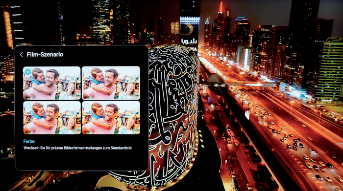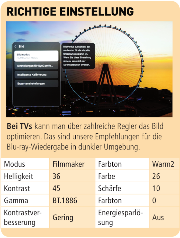 Nichts verändert hat Samsung in diesem Jahr am „EyeComfort“-Modus. Diese Funktion sorgt dafür, dass der Fernseher den Farbton des Bildschirms selbstständig an die Tageszeit anpasst. Dabei wird berücksichtigt, dass es morgens mehr blaues Licht als abends gibt. Den Bildeindruck empfinden wir als durchaus angenehm. Dies trifft ebenfalls auf die Bewegungsdarstellung zu. Wer es liebt, erreicht über die Menü-Einstellungen wunderbar geschmeidige Kamerafahrten und Überflüge.