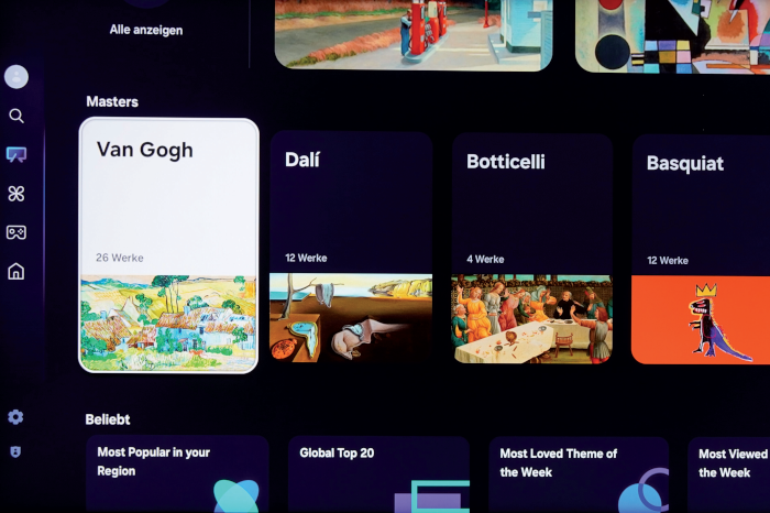 Eingerichtet ist der QN90F blitzschnell über die kostenlos für Android und iOS erhältliche „SmartThings“-App. Das passende WLAN-Netz müssen wir im Test gar nicht manuell aussuchen, auch die Eingabe des Passworts entfällt. Das erledigt der Samsung alles in Eigenregie. Auf der Oberfläche von Tizen OS hat sich auf den ersten Blick fast nichts getan, modifiziert wurden jedoch die Menüs. Der Startbildschirm empfängt die Zuschauer mit waagerecht angeordneten Apps, dazu den Rubriken „Für Sie“, „Live“ und „Apps“. Man sieht sofort in einem kleinen Vorschaufenster, was gerade wiedergegeben wird, und profitiert unter anderem von personalisierten Vorschlägen – zum Beispiel aus Mediatheken. Über die linke Menü leiste hat man Zugriff auf den „Samsung Gaming Hub“, in dem neben aktuellen Spielen auch Klassiker über verschiedene Streaming-Dienste abgerufen werden können. Eine Konsole ist dafür nicht erforderlich. Neu ist der Menü-Eintrag „Kunst“ – was sich dahinter verbirgt, erfahren Sie im Kasten oben.