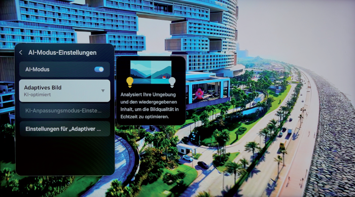 Gut gefällt uns auch das Setting „Adaptives Bild“. Dieses ist KI-optimiert – der Prozessor analysiert die Umgebung des Fernsehers sowie den wiedergegebenen Inhalt, um die Qualität in Echtzeit zu optimieren. Unsere HD-Testsequenzen werden mit dieser Einstellung klarer, schärfer und plastischer, zudem wird minimal erkennbares Bildrauschen effizient beseitigt. Einen tollen Job erledigt auch „Auto HDR Remastering Pro“ – SDR-Inhalte erscheinen auf dem Panel dynamischer und kontrastreicher.