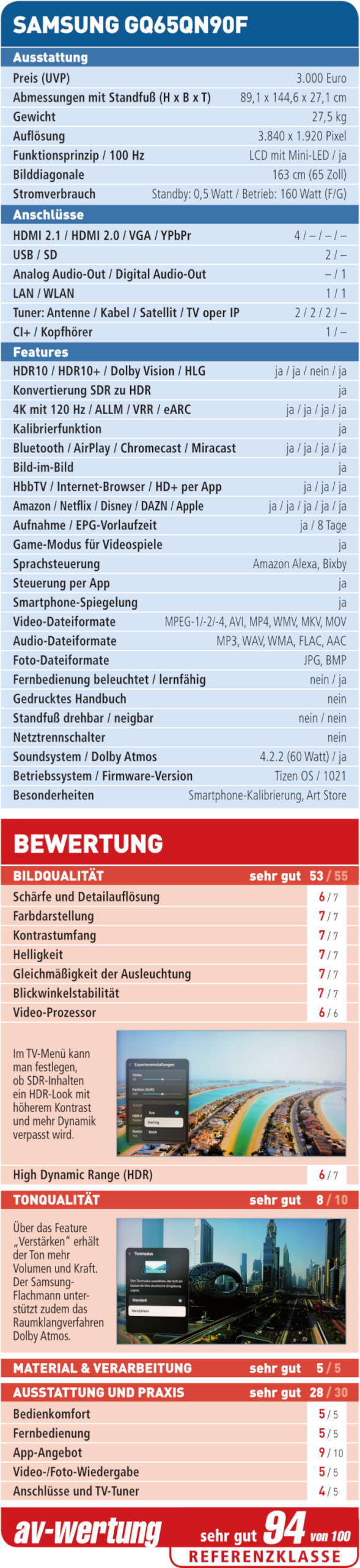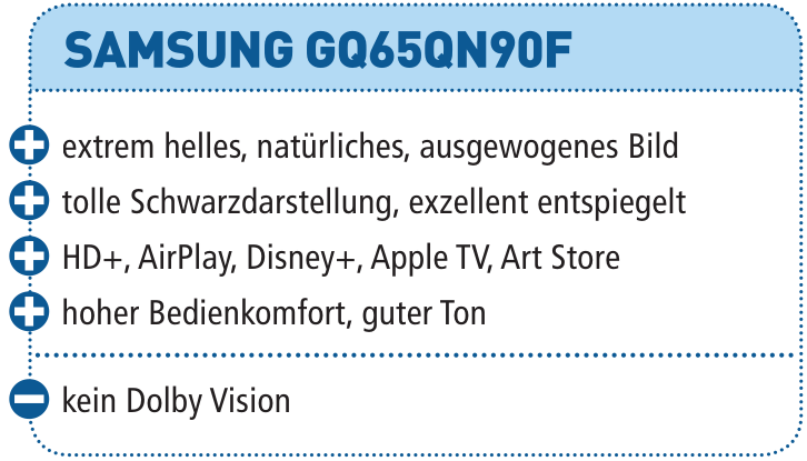 Der hervorragend ausgestattete GQ65QN90F gehört zu den besten LCD-TVs am Markt. Er ist extrem hell, zeigt sattes Schwarz und begeistert durch sein exzellent entspiegeltes Display. Der Einzug in unsere Referenzklasse ist die logische Folge.