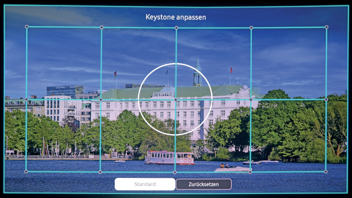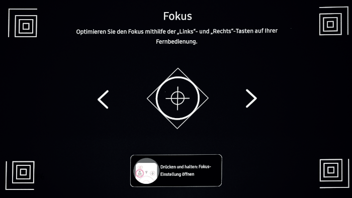 Die Aufstellung ist einfach, wenn der Ultrakurzdistanz-Projektor auf einer ebenen Fläche steht. Sollte dies nicht der Fall sein, kann die Unebenheit des Untergrunds mit den Standfüßen ausgeglichen werden, indem diese entsprechend herausgedreht werden. Den Fokus stellen wir mit der Fernbedienung bequem vom Sitzplatz ein. Bis in die Ecken ist das Bild danach optimal scharf. Damit ist der aufwändigste Part erledigt. Von nun an führt The Premiere 9 den Nutzer durch das Installationsmenü. Dazu gehören: Netzwerkauswahl, Passworteingabe und das Anlegen eines Accounts bei Samsung, damit wir auf alle Smartfunktionen zugreifen können.