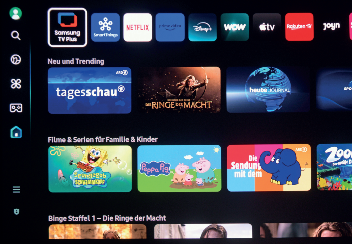 Das Gerät läuft mit dem Betriebssystem Tizen, das wir von Samsung-Fernsehern gut kennen. Die Oberfläche bietet übersichtlich angeordnete Apps. An erster Stelle steht – wenig überraschend – natürlich Samsung TV Plus. Danach folgen alle wichtigen Apps wie Netflix, Prime Video, Disney+, Wow, Apple TV, Joyn und Magenta TV. Die Navigation geht flott von der Hand. Aber auch die Sprachsteuerung funktioniert exzellent. Da wir nicht immer sofort wissen, auf welchem Sender bzw. welcher Plattform der gewünschte Film zu finden ist, sagen wir nur: „Alexa, suche Elvis.“ Sofort werden uns alle Dokumentationen und Spielfilme aufgelistet, die Elvis im Titel enthalten.