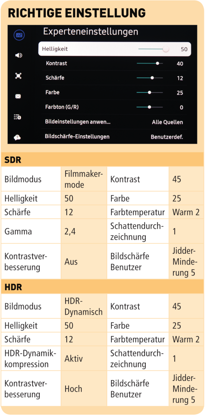 Mit den üblichen Gain/Offset-Reglern, rudimentären Gammaanpassungen und einem Color Management System (CMS) für den Farbraum stehen die bekannten Regler für die Kalibrierung zur Verfügung. Allerdings ist das Farbmanagement für das Gamut nicht vollständig belegt. Es kann nur die Sättigung von Rot, Grün und Blau angepasst werden, nicht aber Luminanz und Lage. Darüber hinaus beeinflussen die RGB-Gain-Regler die Positionen der Sekundärfarben. Das ist zu kritisieren, weil die Gain-Regler lediglich Einfluss auf Weißpunkt und den Graustufenverlauf haben sollen, nicht aber auf die Farborte von Cyan, Magenta und Gelb innerhalb des Farbraums. Dass diese anschließend sogar besser passen, macht die Sache nicht richtiger. Eine Zwischenbildberechnung in 10 Stufen ist integriert. Samsung nennt das Tool verwirrenderweise „Bildschärfe“, und es ist unter den Experteneinstellungen zu finden. Ergänzt wird das visuelle Erlebnis mit einem 2.2.2-Lautsprechersystem. Weitere Features wie „Q-Symphony“, „Active Voice Amplifier Pro“, „Adaptive Sound Pro“ und Bluetooth komplettieren die Audioausstattung.