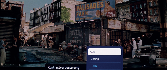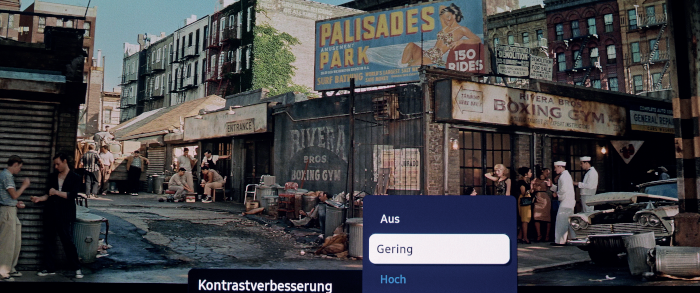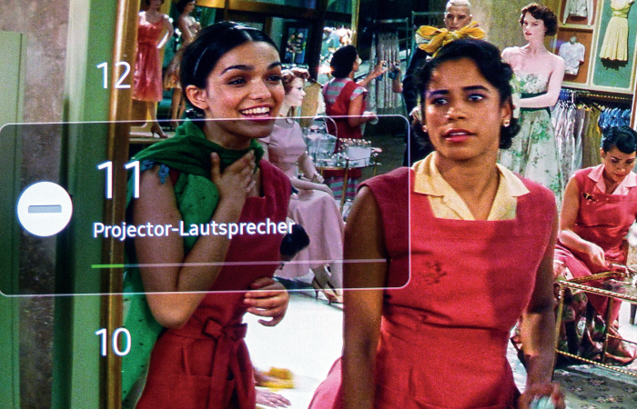 Dolby-Atmos-Effekte, die von der Zimmerdecke tönen sollen, können wir mit „Top Gun: Maverick“ allerdings nicht ausmachen – ein Manko, mit dem sich auch Soundbars herumschlagen. Ebenso finden wir den Bass, der von zwei implementierten Subwoofern kommt, relativ schwach auf der Brust. Grundton, Mitteltöne und Hochton gefallen uns hingegen. Wenn Maria in „West Side Story“ zusammen mit Freunden und Familie „America“ singt, klingt das ansprechend. Das Soundsystem kann es mit Soundbars der 200-Euro-Klasse aufnehmen, mehr aber auch nicht.