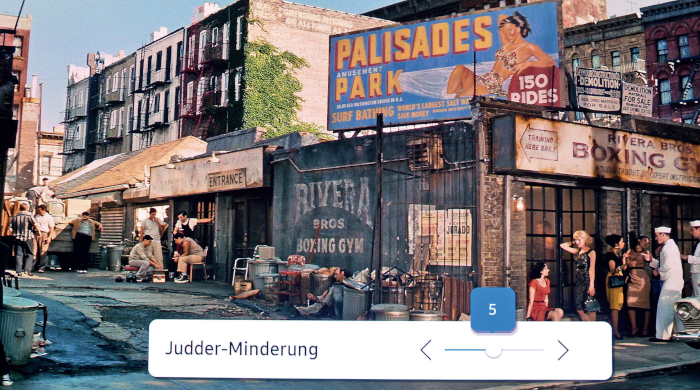 Zur Hochform läuft der Ultrakurzdistanz-Projektor mit Spielfilmen, Dokumentationen und Fußballübertragungen in HDR auf. Die Farben leuchten, dass es eine wahre Wonne ist. Der erweiterte Farbraum Rec.2020 sorgt permanent für echte HDR-Wow-Momente. So ein sattes Rot wie in „West Side Story“, solch ein farbenprächtiges Grün wie in „Unsere Erde 3“, die wir aus England importiert haben, zeigen die ganze Klasse des Samsung The Premiere 9.