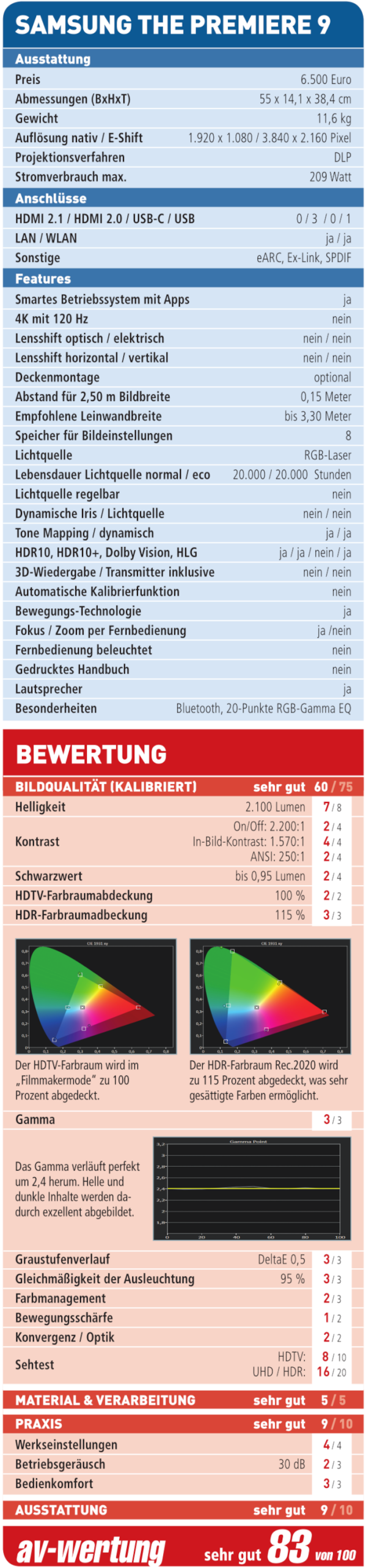 Ab Werk wird The Premiere 9 im Bildmodus „Dynamisch“ ausgeliefert, der sehr gute 2.600 Lumen erzielt, wenn auch mit einer zu kühlen Farbdarstellung von 12.000 Kelvin. Für High Dynamic Range kalibrieren wir diesen Bildmodus, so dass wir netto noch ordentliche 2.100 Lumen auf der Leinwand erhalten. Für SDR-Inhalte nutzen wir hingegen den „Filmmakermode“, der bereits ab Werk eine exzellente Farbpräzision erzielt. Den Weißpunkt passen wir von 6.700 auf 6.500 Kelvin via Gain-Regler an. Der HDTV-Farbraum Rec.709 wird zu 100 Prozent abgedeckt, der HDR-Farbraum Rec.2020 sogar mit 115 Prozent. Die Lichtausbeute für HDTV beträgt nach der Kalibrierung 1.910 Lumen. Die beworbene Maximalhelligkeit von 3.200 Lumen wird mit eingeschaltetem „Spitzenwert für Helligkeit“ sogar übertroffen. Hier ermitteln wir 3.300 Lumen. Damit ist The Premiere 9 rund 400 Lumen heller als der Vorgänger. Wie üblich wird die höchste Lichtausbeute ungeachtet der Farbtemperatur mit einem sichtbaren Grünstich erzeugt. Wir empfehlen, den Projektor für Bildbreiten bis zu 3,32 Meter (150 Zoll) zu verwenden. Bei größeren Diagonalen wird der Wandabstand zu groß. Denn zu den projektionsbedingten 25 Zentimetern kommt die Gehäusetiefe von 38 Zentimetern hinzu. Das addiert sich auf 63 Zentimeter, eine Tiefe, die viele Sideboards nicht besitzen.