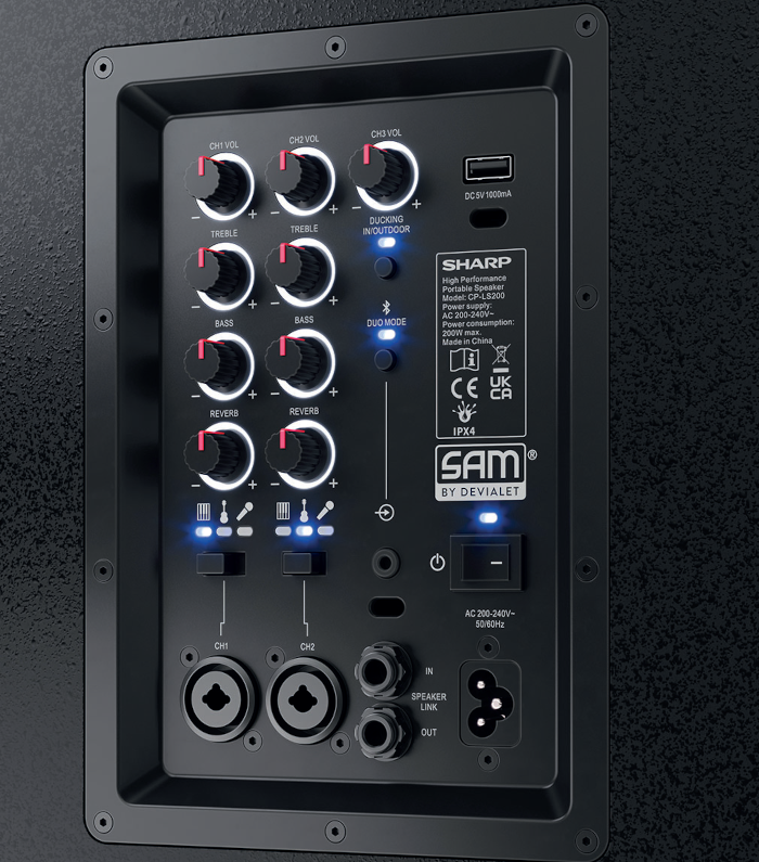 Auch am Grundrauschen im Bluetooth-Modus hat sich nichts getan. Dieses Manko ist aber beim Party-Betrieb zu vernachlässigen. Der austauschbare 5.000mAh-Akku verspricht eine Laufzeit von acht Stunden. Nützlich ist bei ihm die integrierte LED-Anzeige, die den Ladestand verrät. Die „Sharp Life“-App für Mobilgeräte hat sich nicht verändert. Zwar bietet sie individuelle Equalizer mit Preset-Optionen, aber noch immer keine Klangprogramme. Auch eine klassische Fernbedienung glänzt weiter mit Abwesenheit.