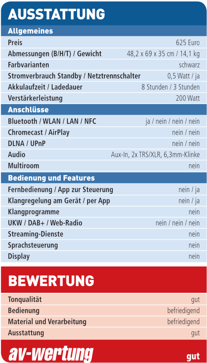 Die solide Partybox für lautstarke Beschallung ist auch für Musikschaffende gut geeignet. Der Klang ist druckvoll, aber nicht sonderlich ausgefeilt.