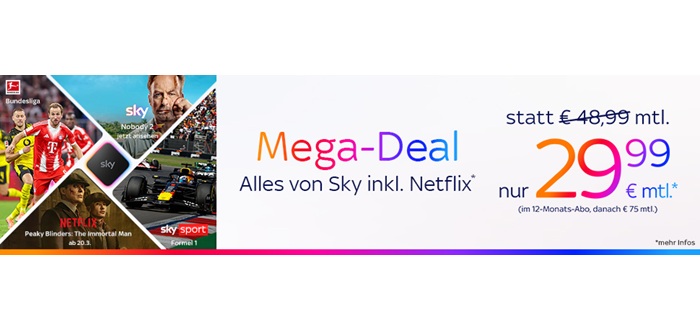 Mega Sport. Mega Entertainment. Mega Deal. Ab sofort gibt es alle Inhalte von Sky inklusive Netflix für 29,99 € pro Monat – nur für kurze Zeit.