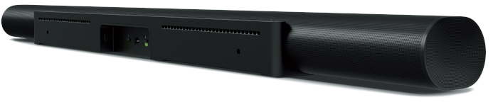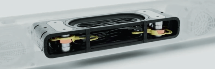 Im Inneren des Korpus befindet sich eine brandneue Architektur mit 14 von Sonos entwickelten Treibern, die von 15 Digitalverstärkern (offenbar zwei für den „Sound Motion“-Basstreiber) angetrieben werden. Die neue Sound-Motion-Technik (siehe Bild rechte Seite) nutzt im Vergleich zur ersten Arc ein verkleinertes, sehr fl aches Tiefton-Chassis mit Doppelmembran, das die zweifache Bassleistung liefern soll. Sieben Kalottenhochtöner möchten für klare Höhenfrequenzen und Dialoge sorgen, inklusive zwei nach oben gerichtete Hochtöner für 3D-Audio, die ihren Schall zur Decke werfen, von wo aus der Sound via Reflexionen zum Hörplatz gelangen soll. Mittlere Frequenzen übernehmen sechs weitere Chassis. Alle Treiber formen laut Sonos zusammen ein 9.1.4-System für 3D-Ton mit Dolby Atmos. Zum Vergleich: die alte Arc besaß eine 5.1.2-Architektur mit 11 Treibern.