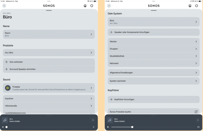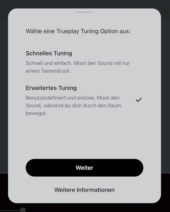 Für Klangtüftler bietet die App eine Dynamikanpassung (Nachtmodus), Lip-Sync und einen Equalizer für Bässe wie Höhen. Die Höhenkanäle lassen sich im Pegel einstellen, ebenso ein externer Subwoofer. Die Sprachverbesserung hat Sonos ausgebaut, die Lautstärke von Dialogen kann nun feiner abgestimmt werden. Die automatische Raumeinmessung „Trueplay“ klappt jetzt auch auf Tablets bzw. Smartphones mit dem Android- Betriebssystem, bisher war die Funktion nur mit iOS-Geräten möglich.