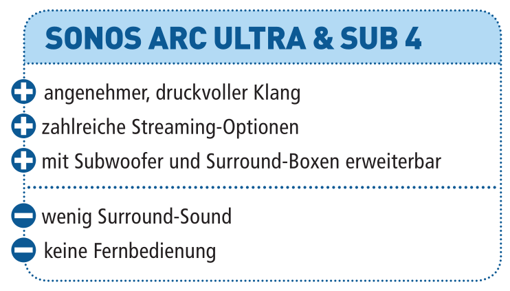 Die neue Sonos Arc Ultra liefert guten Klang, sieht schick aus und punktet mit vielen Streaming-Optionen. Für vollwertigen Surround-Klang benötigt man allerdings zusätzliche Rear-Lautsprecher.