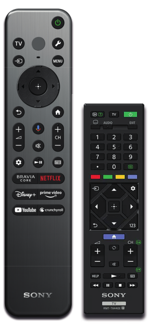 Doppelpack: Nur die wenigsten werden zur Sony-Fernbedienung mit Ziffernfeld greifen. Denn der kleine Signalgeber mit Alu-Oberfläche und beleuchteten Tasten ist die deutlich bessere Wahl. Verarbeitung, Handling und Bedienkomfort sind exzellent. Streamingdienste lassen sich zudem direkt erreichen.