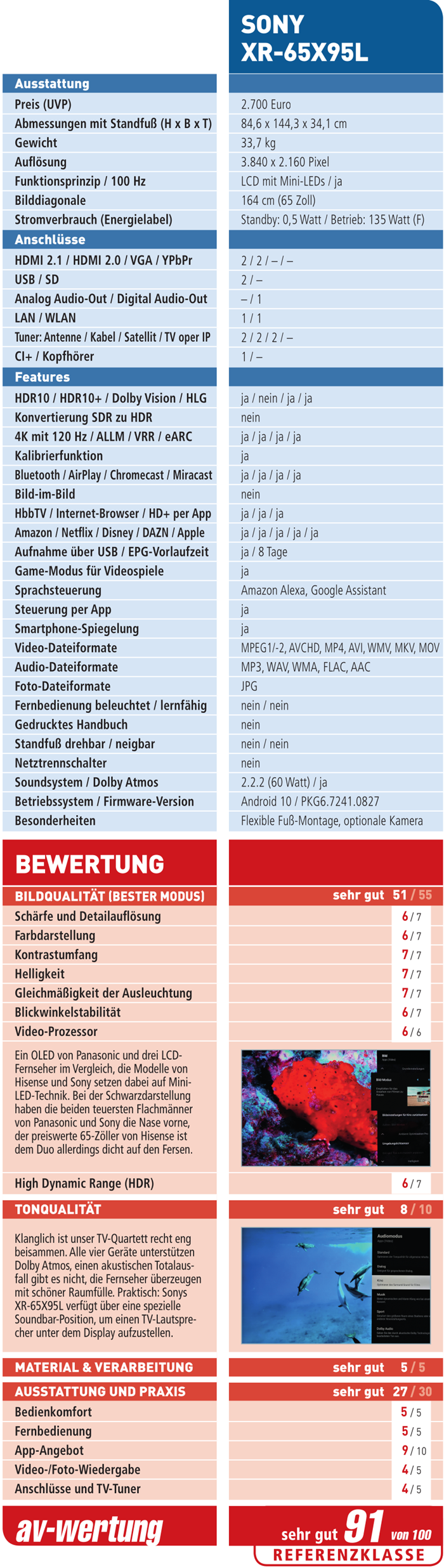 Der Testbericht Sony XR-65X95L (Gesamtwertung: 91, Preis/UVP: 2.700 Euro) ist in audiovision Ausgabe 9-2023 erschienen.