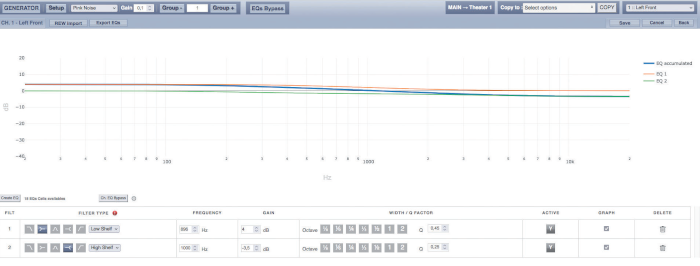 • Neben den üblichen Parametern wie Pegel (0,1-dB-Einheiten) und Abstände zum Hörplatz (1-cm-Schritte) gibt es einen Limiter, der den Ausgabepegel auf einen definierten Wert beschränkt, um eine Schädigung von Lautsprecher oder Verstärker zu vermeiden. Ferner lässt sich die Polarität einer jeden Box umkehren. Mit dem TiltEQ kann man den Klang „heller“ oder „dunkler“ gestalten, was sinnvoll ist, wenn Lautsprecher zum Beispiel hinter einer motorisierten Leinwand stehen und sich damit die akustischen Bedingungen permanent ändern. Natürlich könnte man dieses Problem auch mit mehreren Dirac-Filtern angehen.