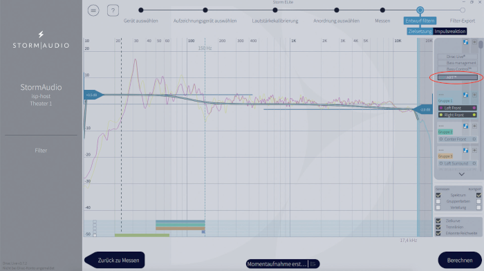 Für die Nutzung von ART werden mindestens 9 Messpositionen benötigt. Die Messung und Modifikation der Zielkurve nach persönlichen Wünschen (Stormaudio stellt auch eigene Zielkurven zum Download bereit) läuft wie gewohnt und oft in der audiovision beschrieben ab.