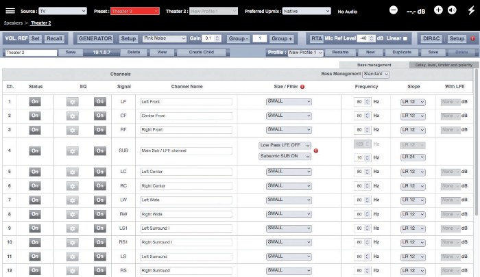 Die Boxenkonfiguration ist komplex und braucht Einarbeitung. Im ersten Schritt wird ein „Layout“ erstellt. Auf der 2D-Ebene lassen sich maximal 19 Lautsprecher an unterschiedlichen Positionen defi nieren. Auf der Height-Ebene sind 5 Speaker (4 x Height und 1 x Height Center) realisierbar, auf dem Top-Layer stehen 7 Lautsprecher (6 x Top-Speaker und Voice of God) zur Wahl. Aus den möglichen Positionen (siehe Foto) kann man sich sein Wunsch-Layout zusammenbasteln, das als so genanntes „Theater“ im „Layout“ abgelegt wird. Bis zu 6 unterschiedliche „Layouts“ darf man erstellen, in denen ein „Theater“ und dazugehörige „Sub-Theatres (für Kopfhörer- oder Zonen-Wiedergabe) möglich sind. Innerhalb eines „Theaters“ kann man „Profile“ speichern, wie viele, verschweigt das Handbuch, wir haben mit bis zu 5 Profilen hantiert, auch 10 und mehr sind machbar. Ein „Profi l“ umfasst die individuelle Anpassung aller im „Theater“ definierten Lautsprecher inklusive Equalizer und die Zuweisung eines der bis zu 10 speicherbaren Dirac-Filter. Automatisch von Dirac generierte Profile lassen sich allerdings nicht bearbeiten, sondern müssen zuerst in ein neues Profi l umkopiert werden, bevor man Änderungen durchführen kann. Dann lassen sich alle Funktionen nutzen, die auch ohne Dirac-Filter justierbar sind, als da wären: