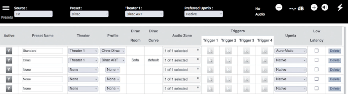 Unter „Presets“ legt man Schnellwahlspeicher an. Jedem Preset kann ein Theater (Boxenlayout), ein Profil (Konfiguration eines Boxen-Layouts, optional mit Dirac), eine Audiozone, Trigger, ein optionaler Upmixer und der Low-Latency-Modus zugewiesen werden. Über die Fernbedienung oder die Software-Remote lassen sich Presets bequem anwählen.